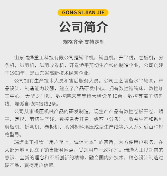 山東瑞燁重工科技有限公司主營校平機(jī)、開平機(jī)、縱剪機(jī)等產(chǎn)品。